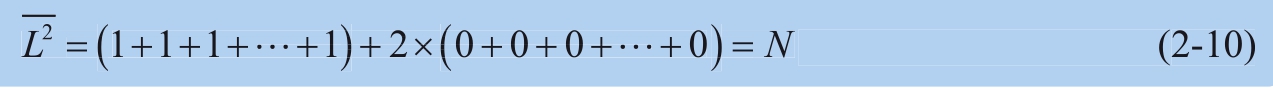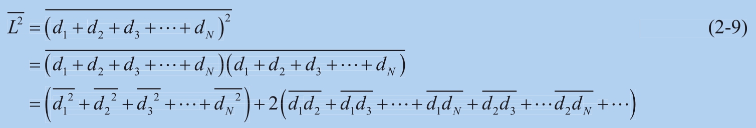 但是,多次移动后位置坐标值的平均,对于这个红点最终在数轴上的真正位置,无法给出有价值的信息。换一个角度考虑,因为位置坐标值的平方,即 L 2 一定不为负值,通过求 L 2 移动的平均值,则可以进一步得到 L 的位置的坐标。以 N 次移动为例,通过式(2-9)可以计算 L 2 。
