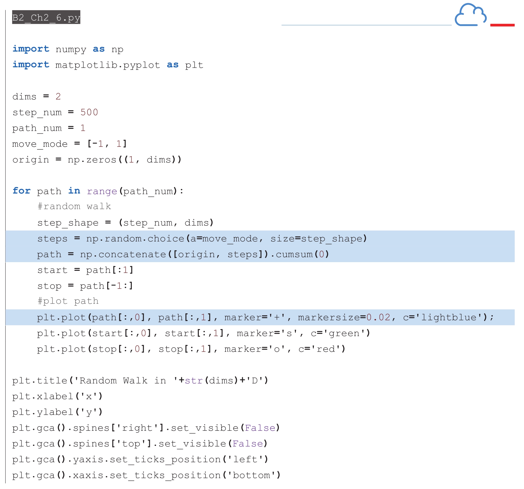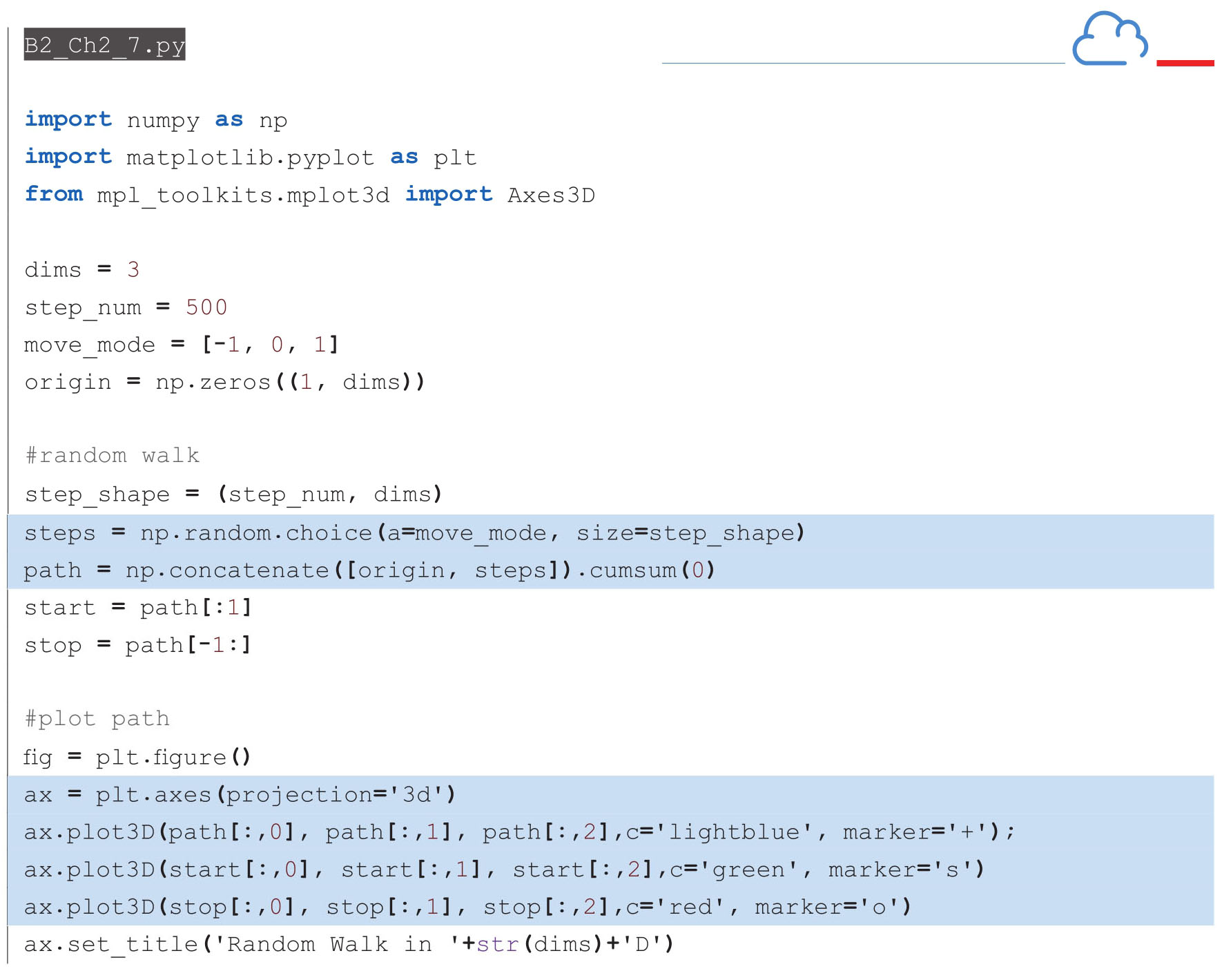 运行代码生成了图2-12。这里的三维随机漫步也是从绿方格处起始,在红圆点处终止。起始点与终止点之间的路径完全遵从随机过程,每次运行代码都会产生完全不同的另外一幅路径图形。