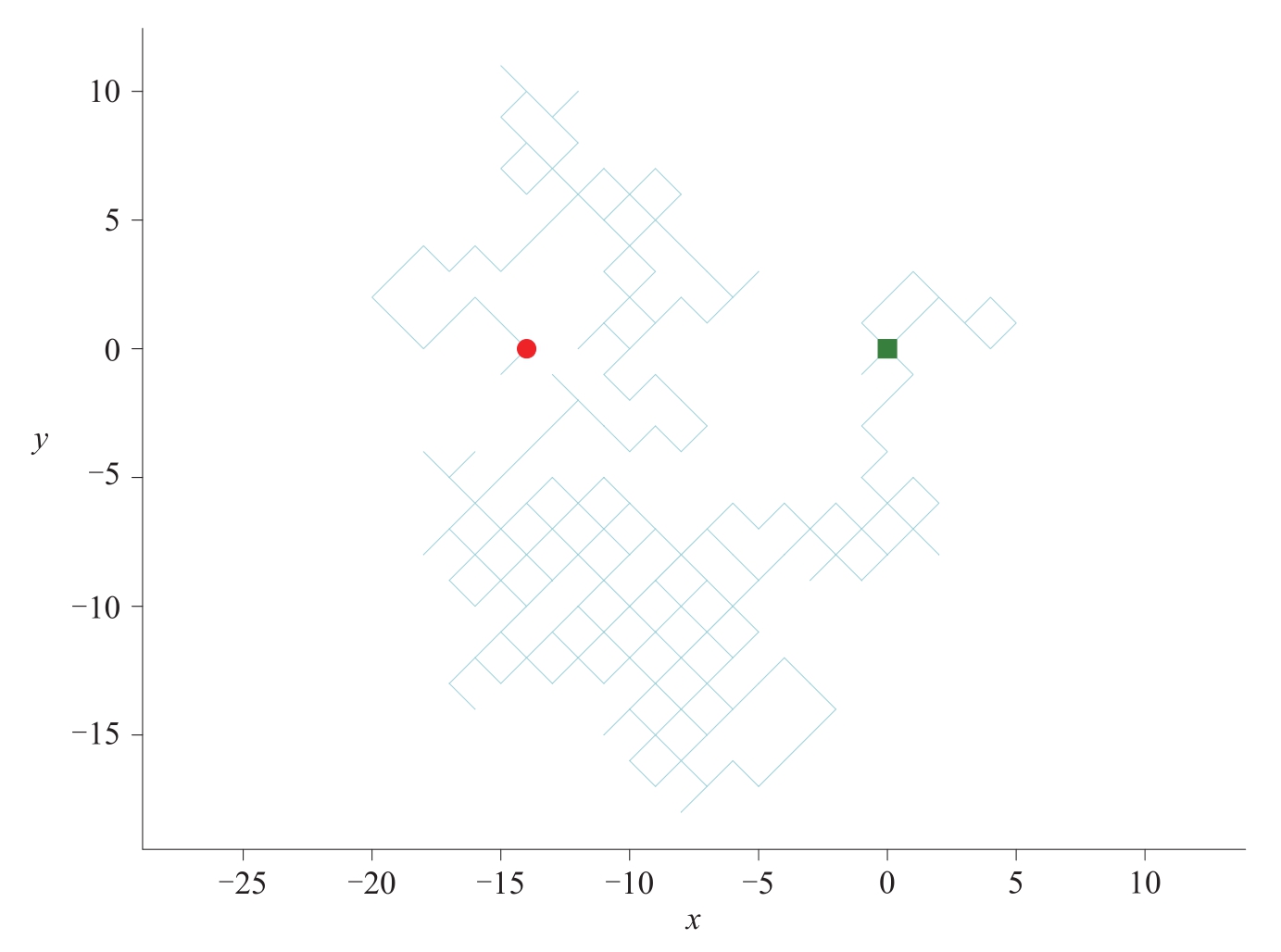 二维随机漫步 (two-dimensional random walk)是指在一个二维平面上四个可能方向上随机游走。如图2-11所示,从绿方格起始,在红圆点处终止。