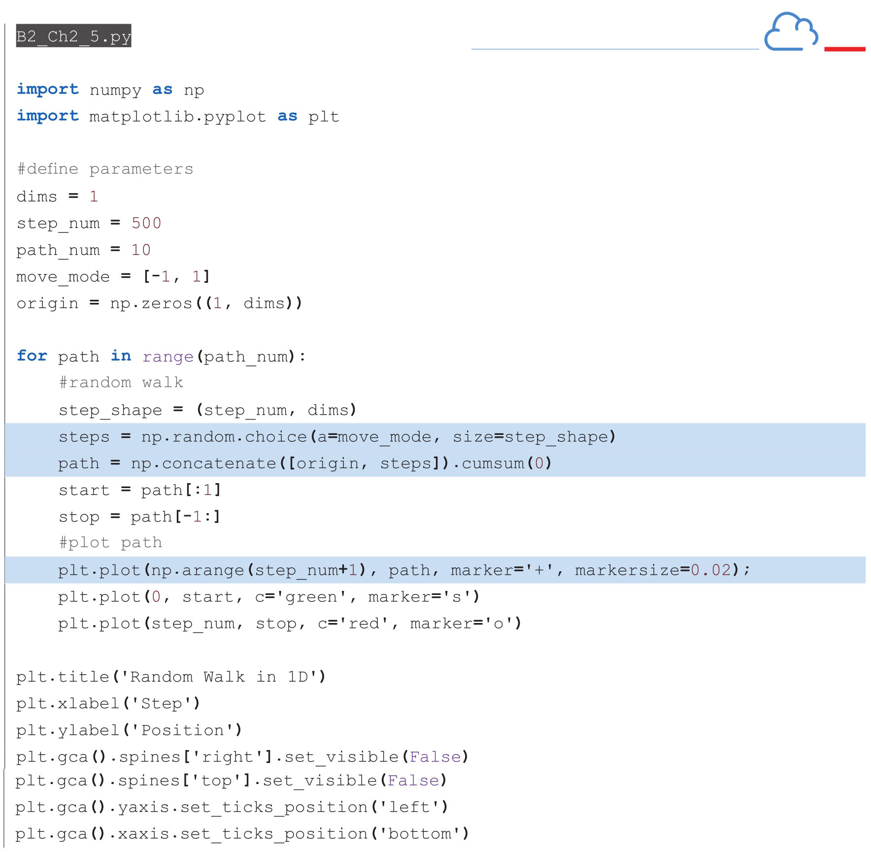 随机漫步 (random walk)是指从起始点开始移动的一个随机过程。随机漫步的每一步均无“记忆性”,即每一步对其他步无任何影响,因此随机漫步具有马尔可夫链的性质。随机漫步可以处于不同的维度,本节会依次介绍一维、二维和三维随机漫步。