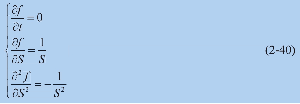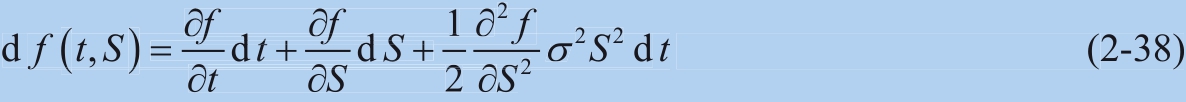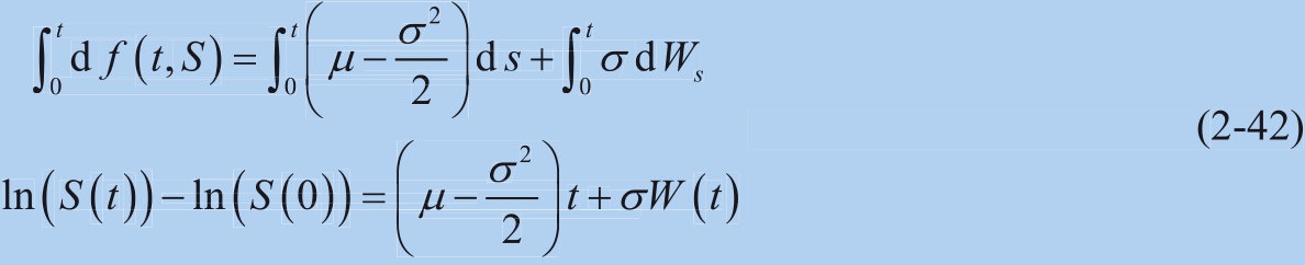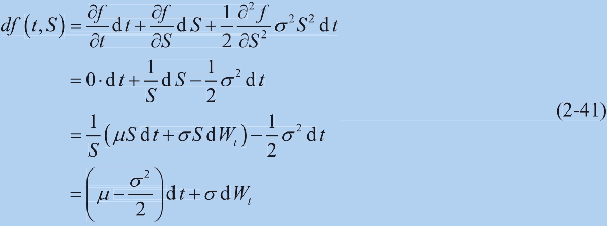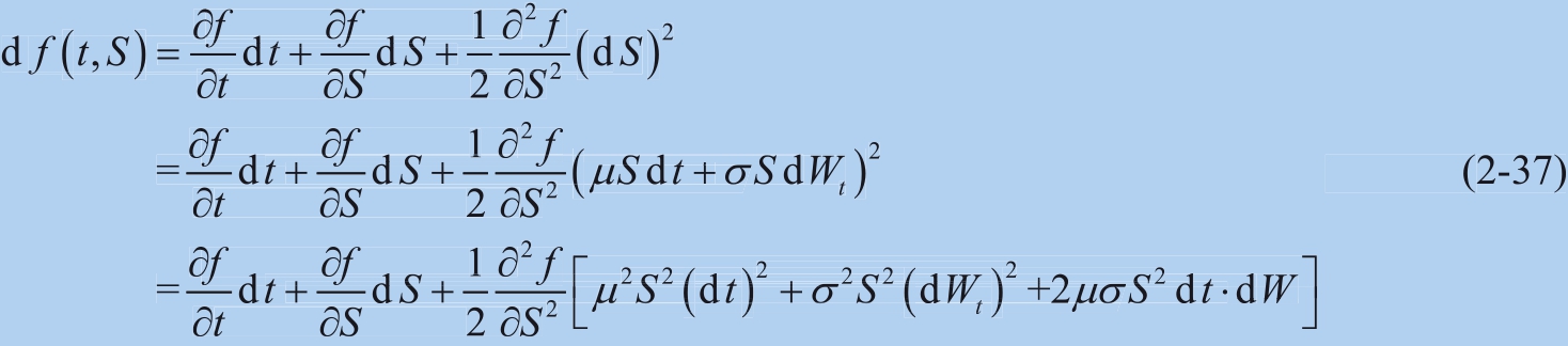 下面将详细介绍几何布朗运动 S 的求解。根据前面介绍过的伊藤引理,对于一个关于时间 t 和维纳过程 S 的函数 f ( t , S )进行微分,数学表达式为: