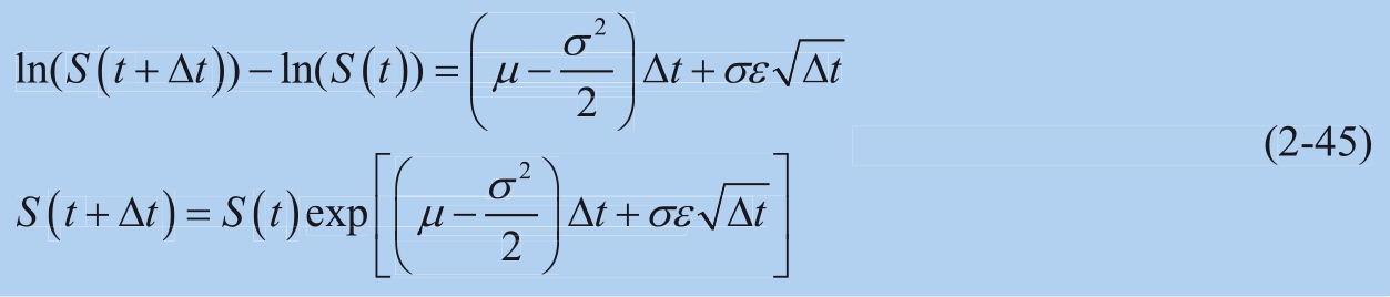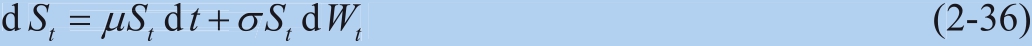 几何布朗运动的数学表达式非常简洁。如果一个随机过程 S t 满足如式(2-36)所示的 随机偏微分方程 (Stochastic Differential Equation, SDE),那么 S t 遵循几何布朗运动。