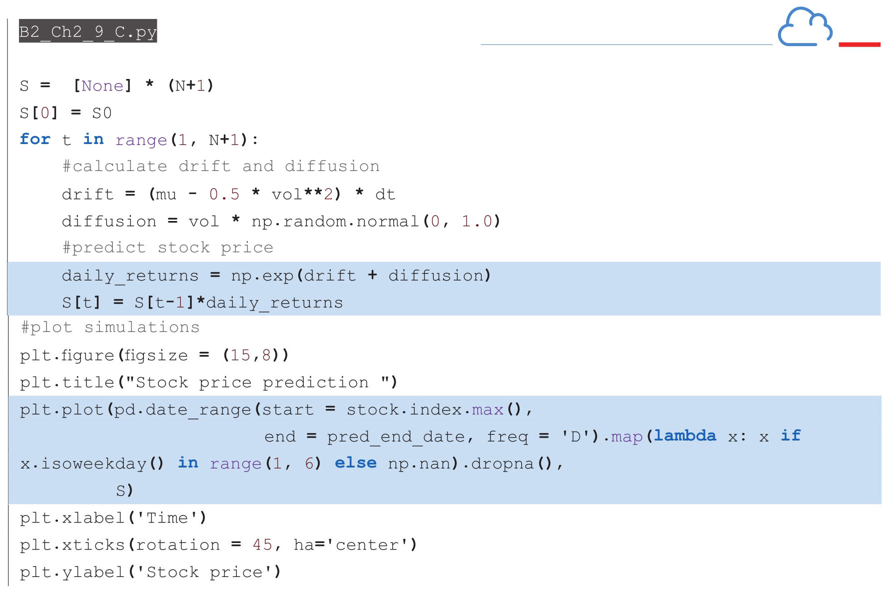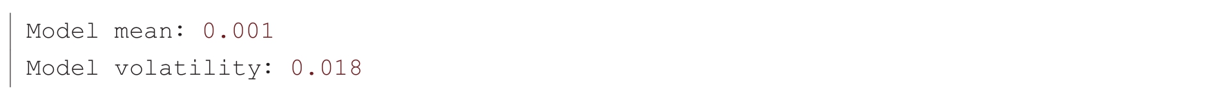 如图2-18所示仅为一次模拟的结果,感兴趣的读者可以多次运行代码,可以发现,每次模拟结果都互不相同,这是由于模型中随机项的影响。因此在实际应用中,一般会利用蒙特卡罗方法进行模拟,本书第3章蒙特卡罗模拟会对此有详细介绍。