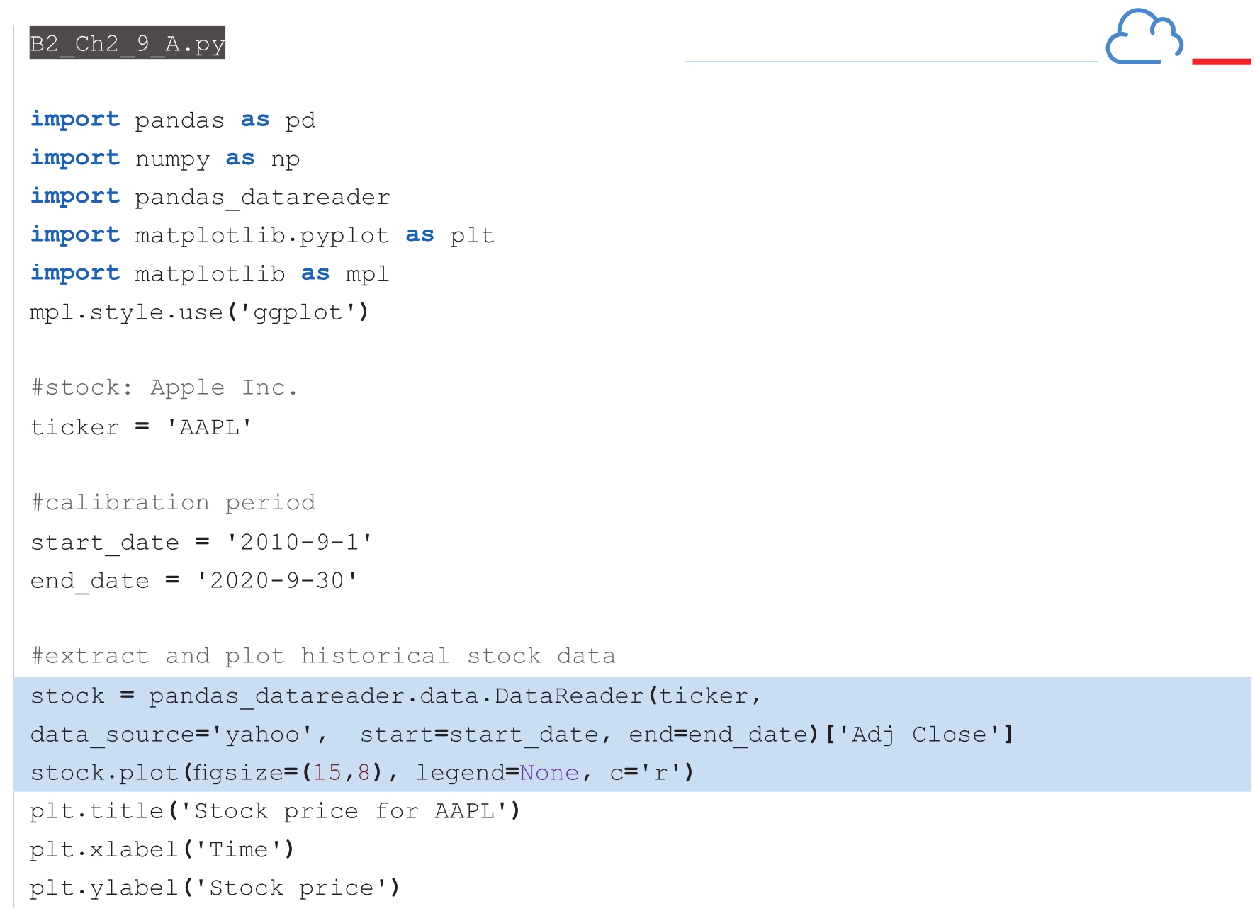 下面的代码首先从雅虎数据库中提取了从2010年9月1日到2020年9月30日十年之间苹果公司股票的收盘价格,然后对其进行了可视化,如图2-17所示。