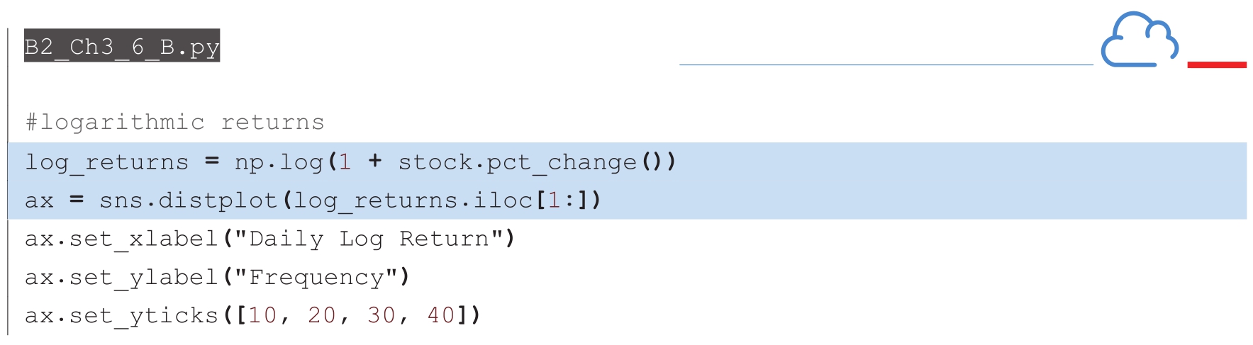 如下面代码,利用历史数据,可以计算股票的日对数收益率,如图3-9所示为日对数收益率的分布。