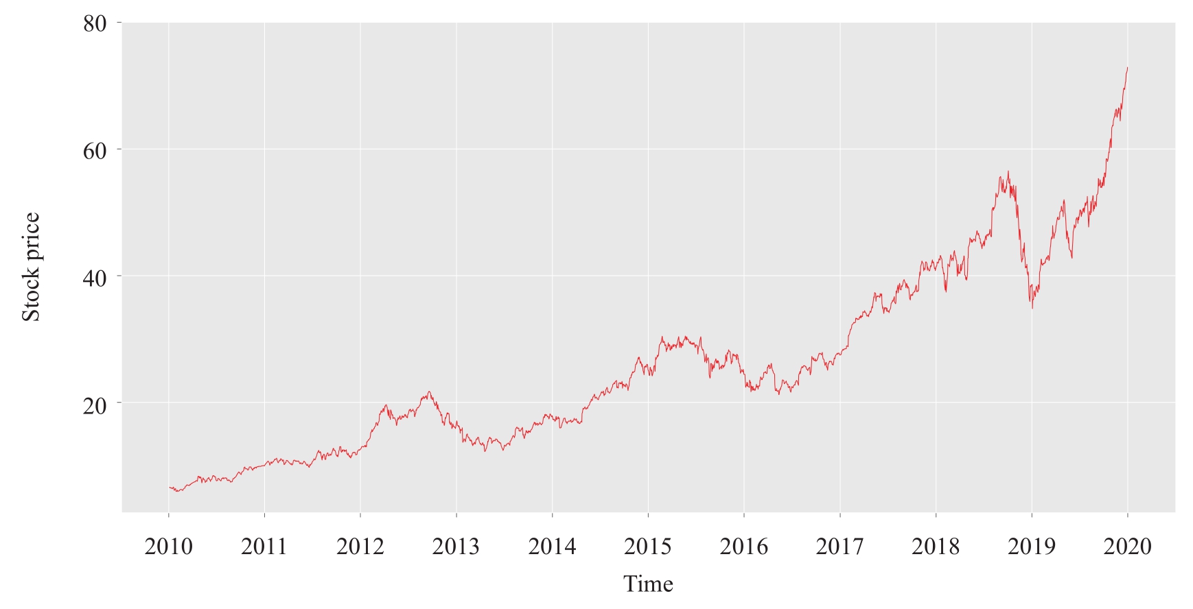 图3-8 苹果公司(AAPL)股票调整收盘价历史数据(2010.01.01—2019.12.31)