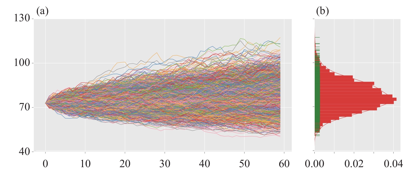 最后,利用校准得到的参数,可以进行蒙特卡罗模拟。下面为程序预测之后60天的股价变化情况,模拟次数设定为2000次。如图3-10(a)所示为2000次模拟的60天内每天的股价变化。如图3-10(b)所示为最后一天,即第60天时股价的分布情况。