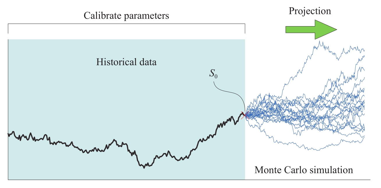 在第2章随机过程,讲解过利用公式直接计算得到股票的价格。众所周知,股票价格的变动经常被认为是一个随机的过程,下面,将用蒙特卡罗模拟来预测股票价格。如图3-7所示为利用蒙特卡罗模拟进行股价预测的流程图。首先基于历史数据估计模型的参数,然后利用蒙特卡罗模拟预测未来股价走势。