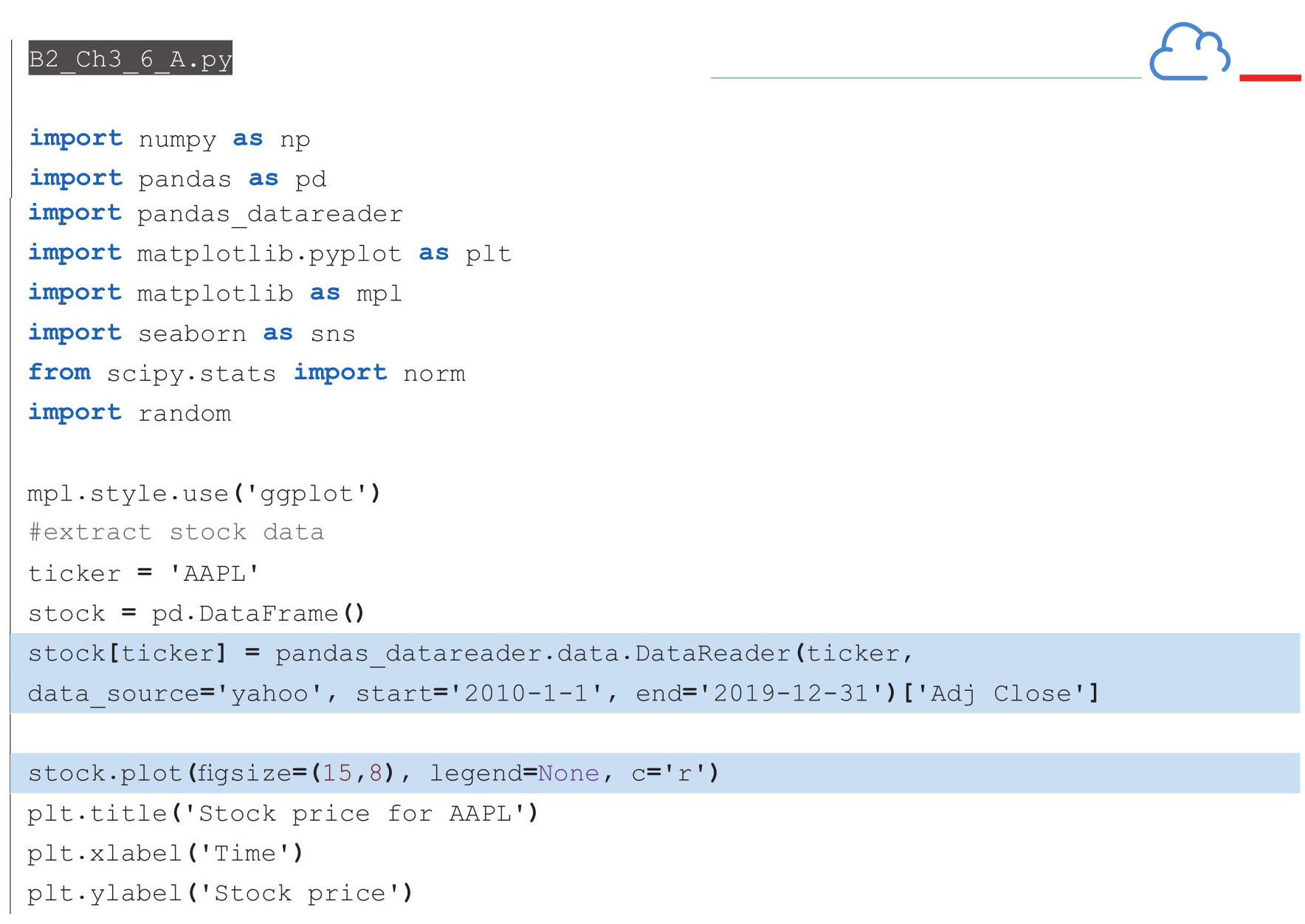 以苹果公司股票为例,首先需要确定式(3-9)的参数,也就是建模中的模型校准,一般可以通过分析历史数据得到。下面的代码,可以提取从2010年1月1日至2019年12月31日苹果公司股票的调整收盘价,并作图展示,如图3-8所示。
