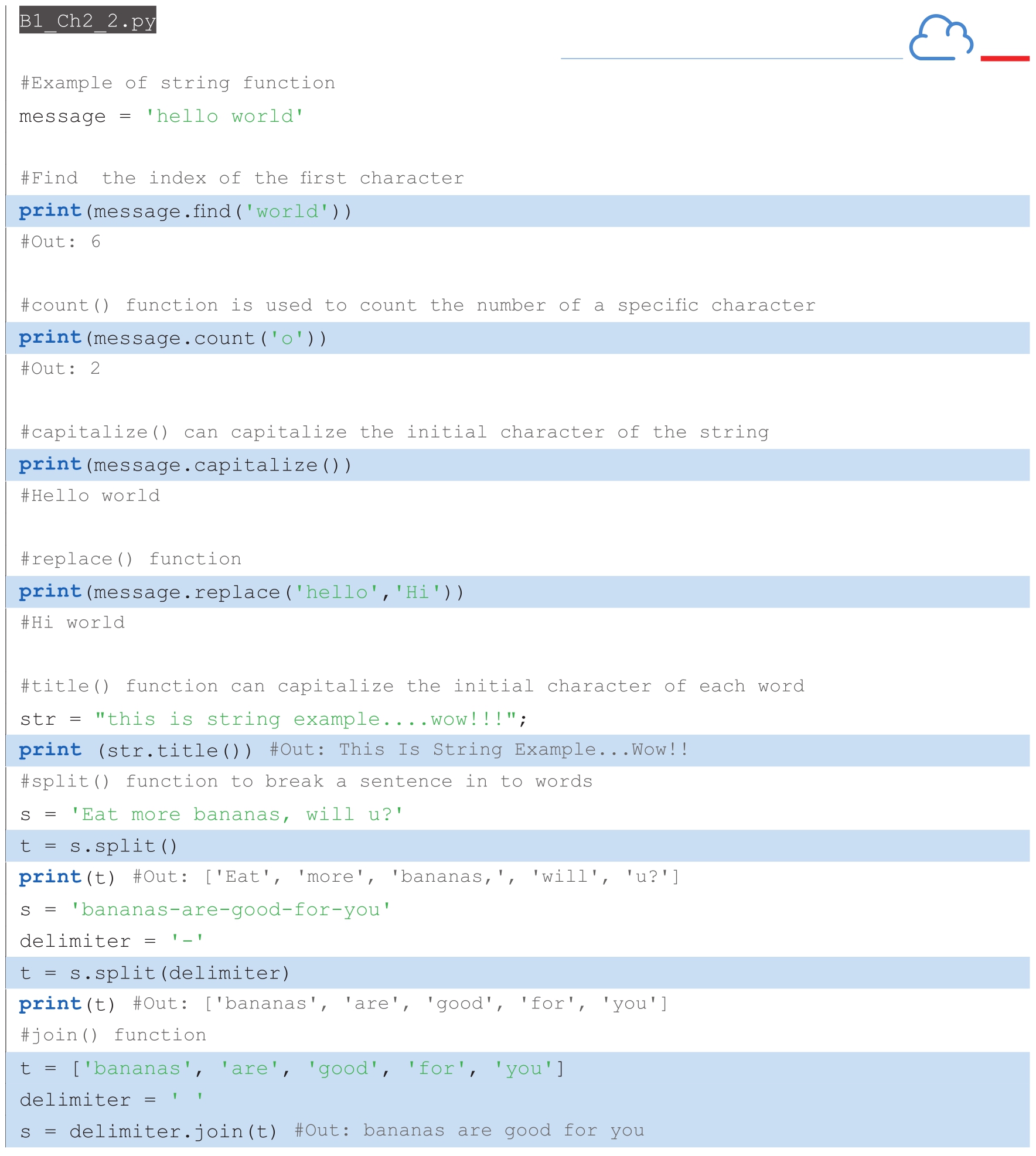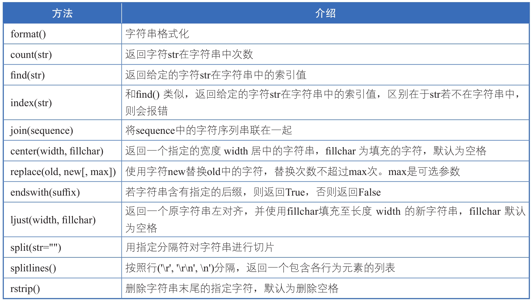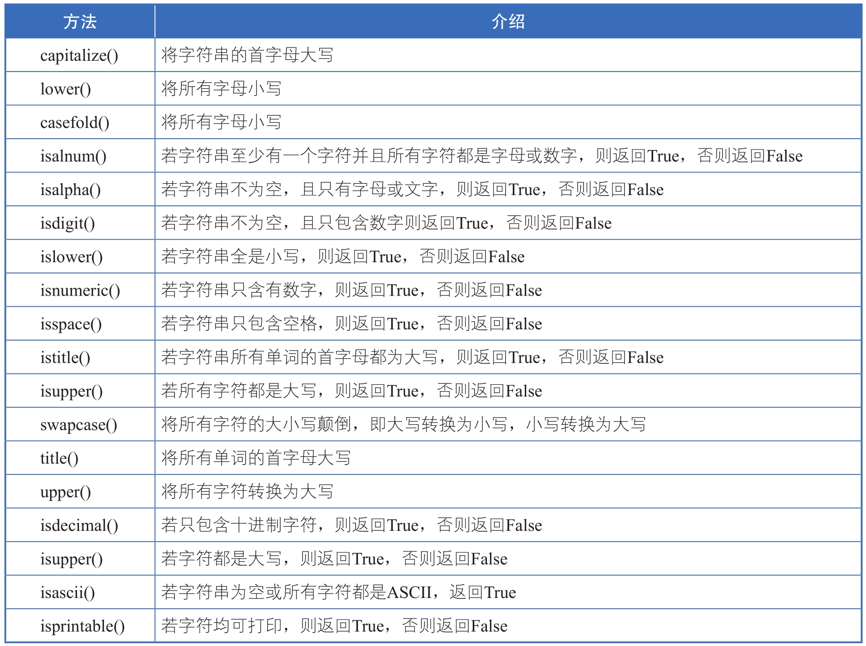 字符串的方法可以接收参数,也可以不接收参数。如表2-4所示为所有不接收参数的字符串方法,这些方法常常用于对字符串的格式进行修改,如将字符串大写的方法capitalize()等。如表2-5所示为接收传入参数的字符串方法,如字符串格式化方法format()等。关于format()方法的介绍已经在本节的开头详细介绍过。以下例子展示了如何使用字符串查找方法find()、统计方法count()、字符所有单词首字母大写方法title()、字符串连接方法join()和字符串分隔方法split()。