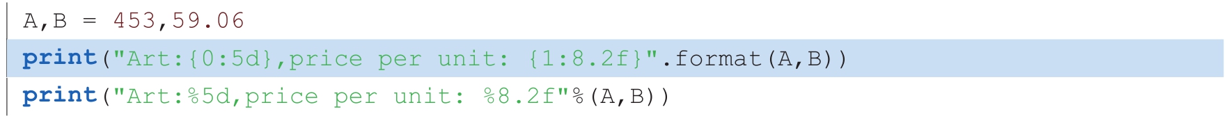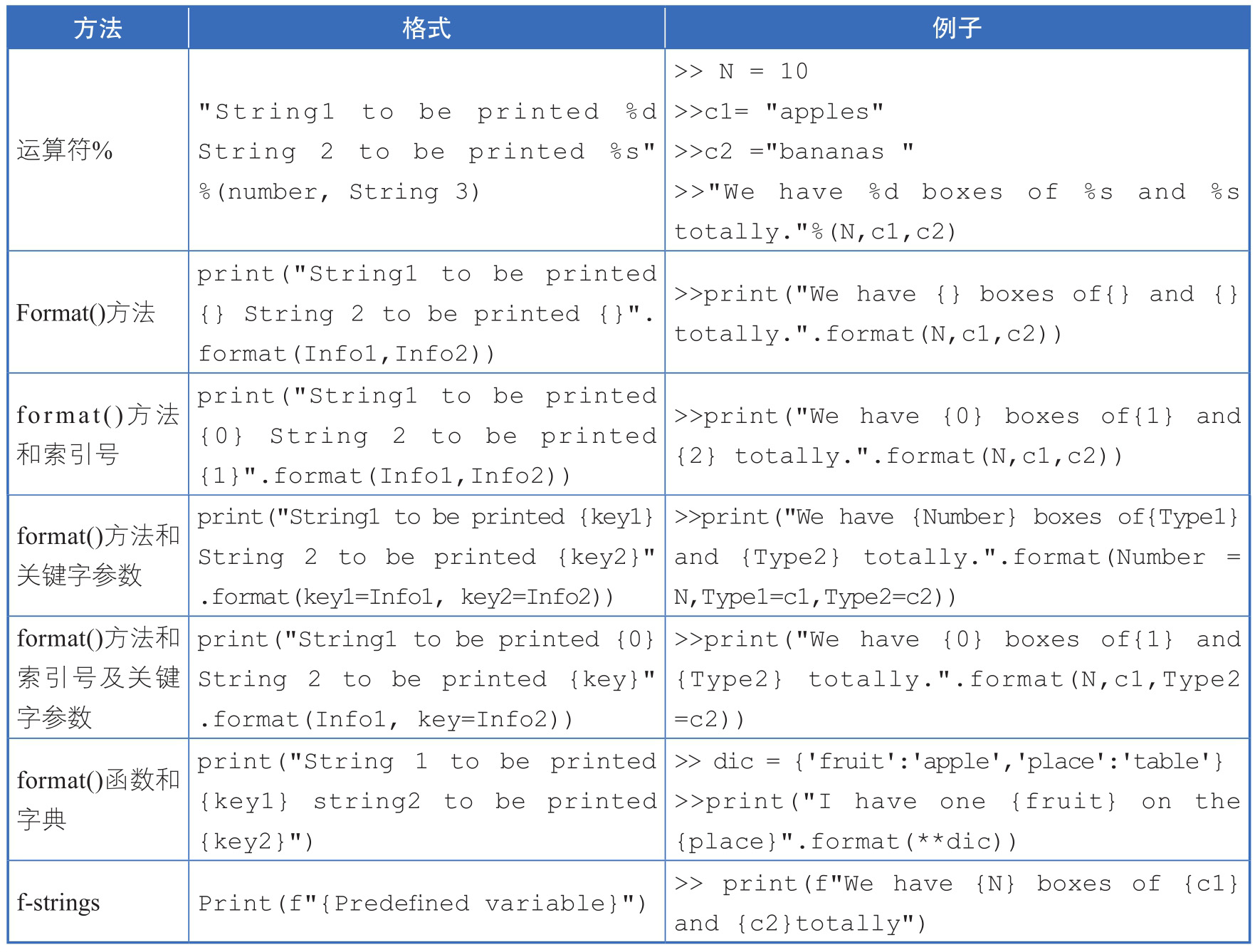 在输出字符串信息时,待输出的信息中常常同时包含一些变量,这些变量可以是字符串、整数、浮点数等。如表2-3所示,这7种方法可以让输出的字符串中包含变量值。这7种方法主要包括三大类:①使用运算符%;②使用format()方法;③使用f-strings。第一和第二种方法最大的区别是是否需要花括号。使用运算符%方法不需要使用花括号,而使用format()方法则需要使用花括号。表2-3列出了5种使用format()的方法。f-strings的全称是 格式化字符串常量 (formatted string literals),是Python 3.6版后新引入的字符串格式方法,可使得格式化字符串的操作变得简单。