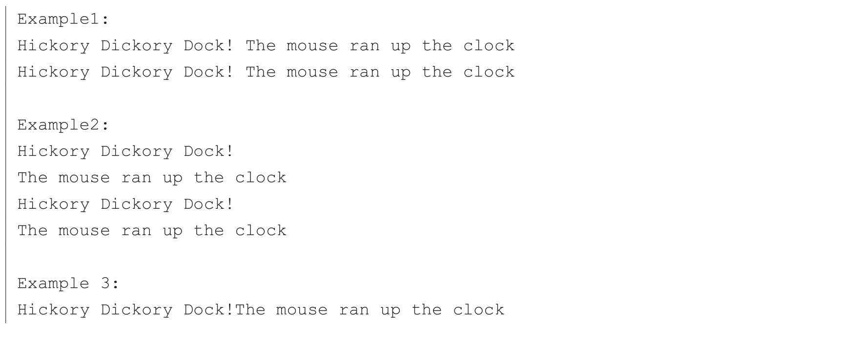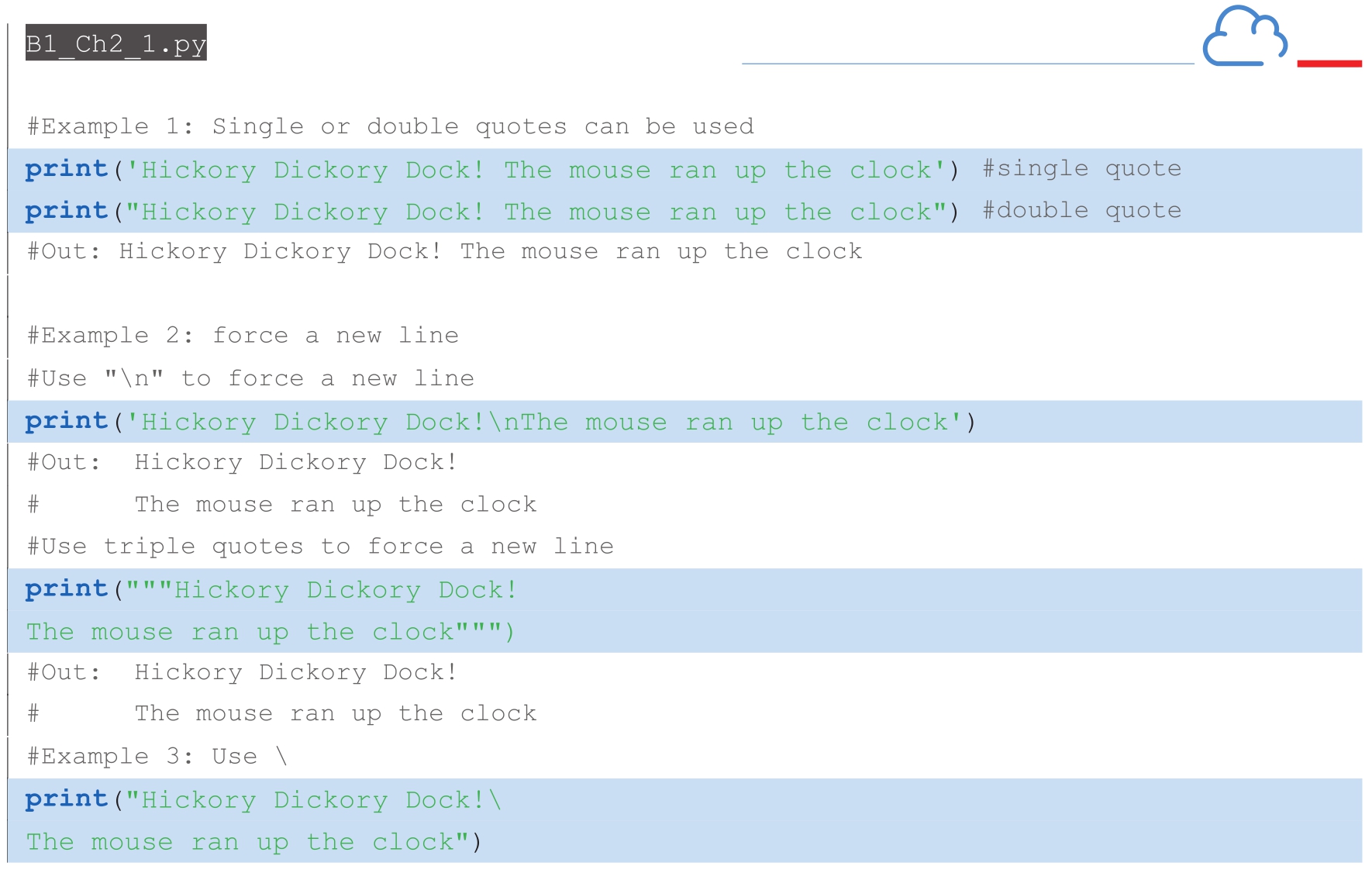通常需要使用单引号或者双引号来表示字符串。下面的代码展示了三个使用引号来表示字符串的例子。在第一个例子中,使用单引号(')或者双引号(" ")来表示字符串,这时候字符串的字符不多,只占用了一行。当字符串的字符较多,需要占用多行时,需要使用换行符号\n或使用三个引号" " "输出多行字符串。使用“\”来连接多行的字符串。