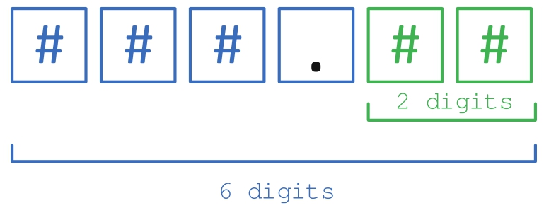 在表2-3中,变量都是整数。当变量为浮点数时,则在输出该浮点数时,需要调整输出的浮点数的位数,这些位数包括小数点前的位数和小数点后的位数。如图2-1展示了如何使用%6.2f来控制小数点前后的位数。%6.2f中,f表示该变量是一个浮点数,2表示只显示两位小数,而6表示总的位数为6位,包括小数点前的数字、小数点后的数字、小数点本身及数字前的空格。
