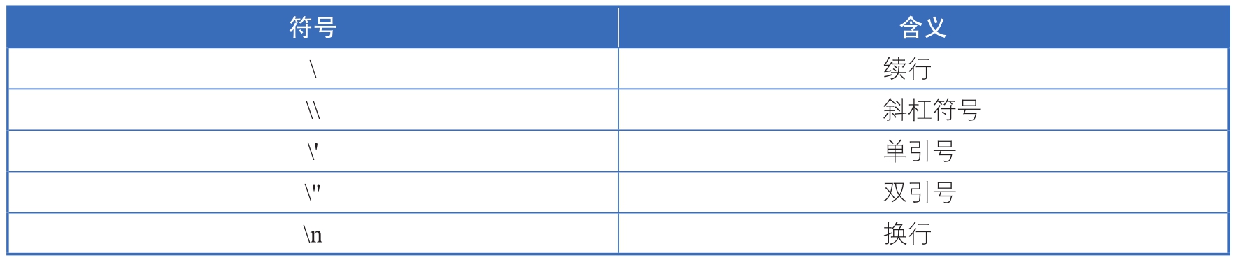 在输出字符串时,有一类字符的输出需要特别注意,这类字符被称作 转义字符 (escape character)。当把转义字符放入待输出的字符串时,系统识别后将其解释成特殊含义的字符或输出格式。比如用户若希望输出的字符串中包含单引号和双引号,则需要与转义字符结合使用,具体形式为\'和\"。如表2-2所示常用的一些转义字符,包括续行、斜杠符号、单引号、双引号和换行。