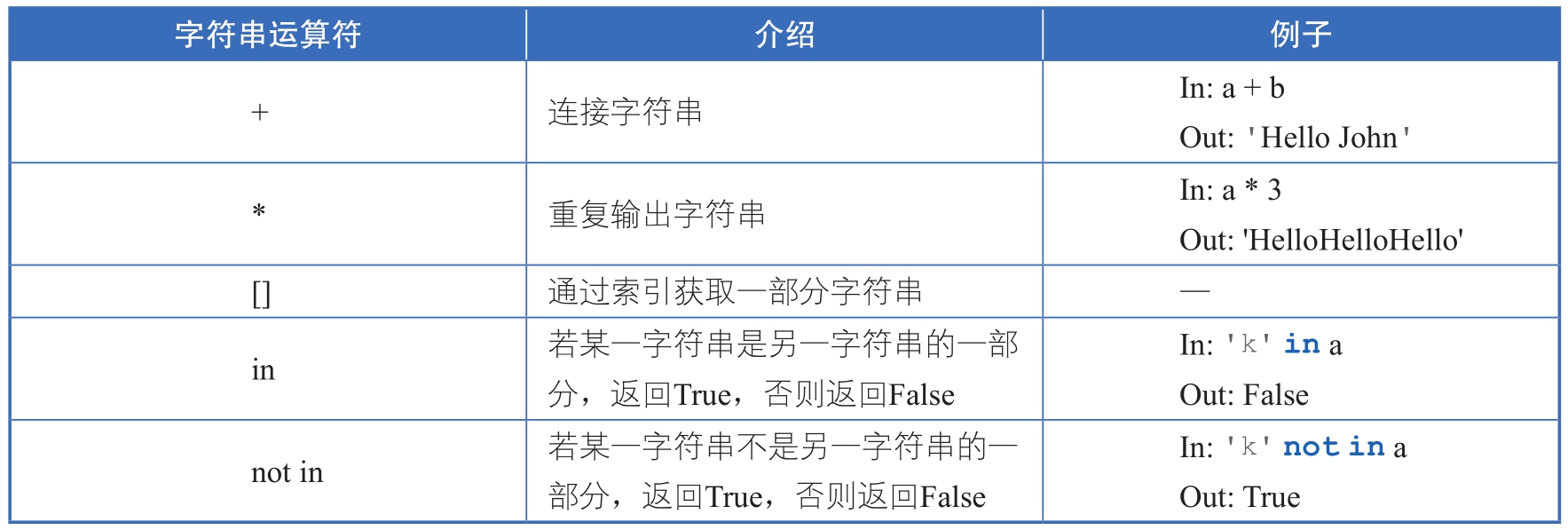 首先介绍常见的几个字符串运算符,如表2-1所示,这些运算符包括+、*、in、not in等。+用于连接两个字符串,*用于重复输出字符串。类似列表和元组,索引运算符[]同样可以被用来获得某一索引位置的字符值。in和not in是两个关键字,可以用来判断某一字符是否在字符串中。