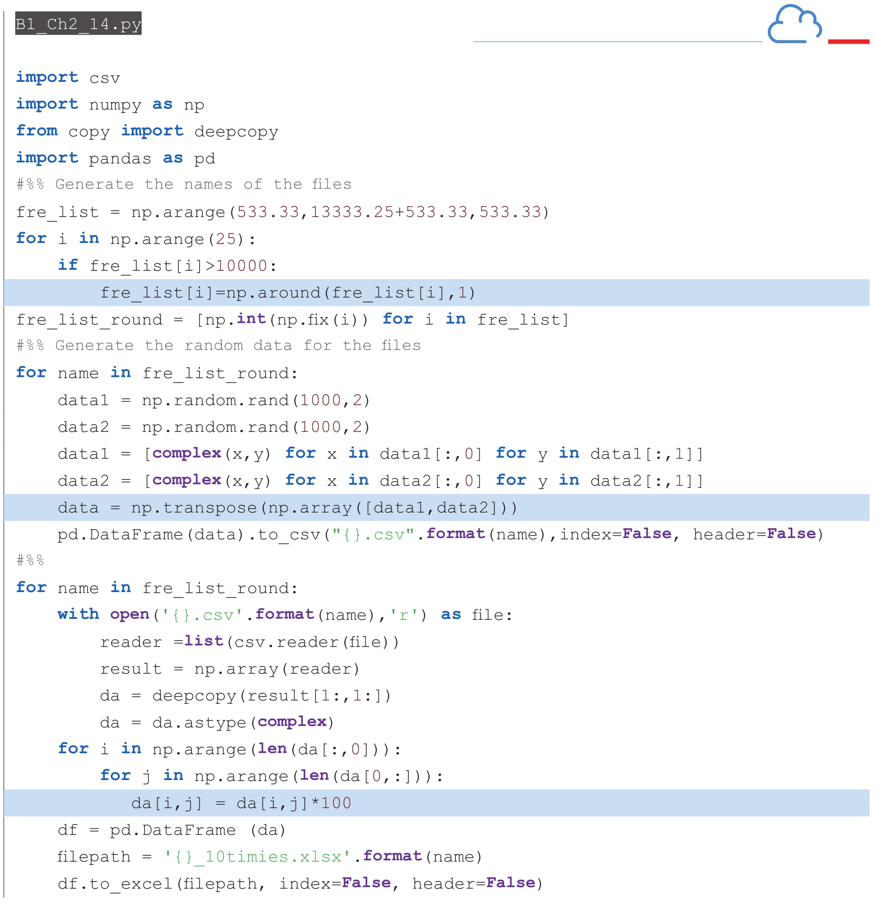 下面是一个许多工作都会遇到的例子。有一批CSV文件需要处理,这些CSV文件中的数据量很大。具体需要完成的操作是把文件中所有的数值增大十倍。这些CSV文件是以一个等差数列的整数部分命名,这个等差数列的首项和公差均是533.33,尾项是13333.25。为了模拟这个过程,首先用Python的随机数生成器生成这些文件和数据,然后通过逐个读取这些CSV文件中的数据,将数据放大十倍,并分别写入后缀为xlsx的文件中,这些xlsx文件的名字同样是前文提到的等差数列的整数部分具体见如下代码。