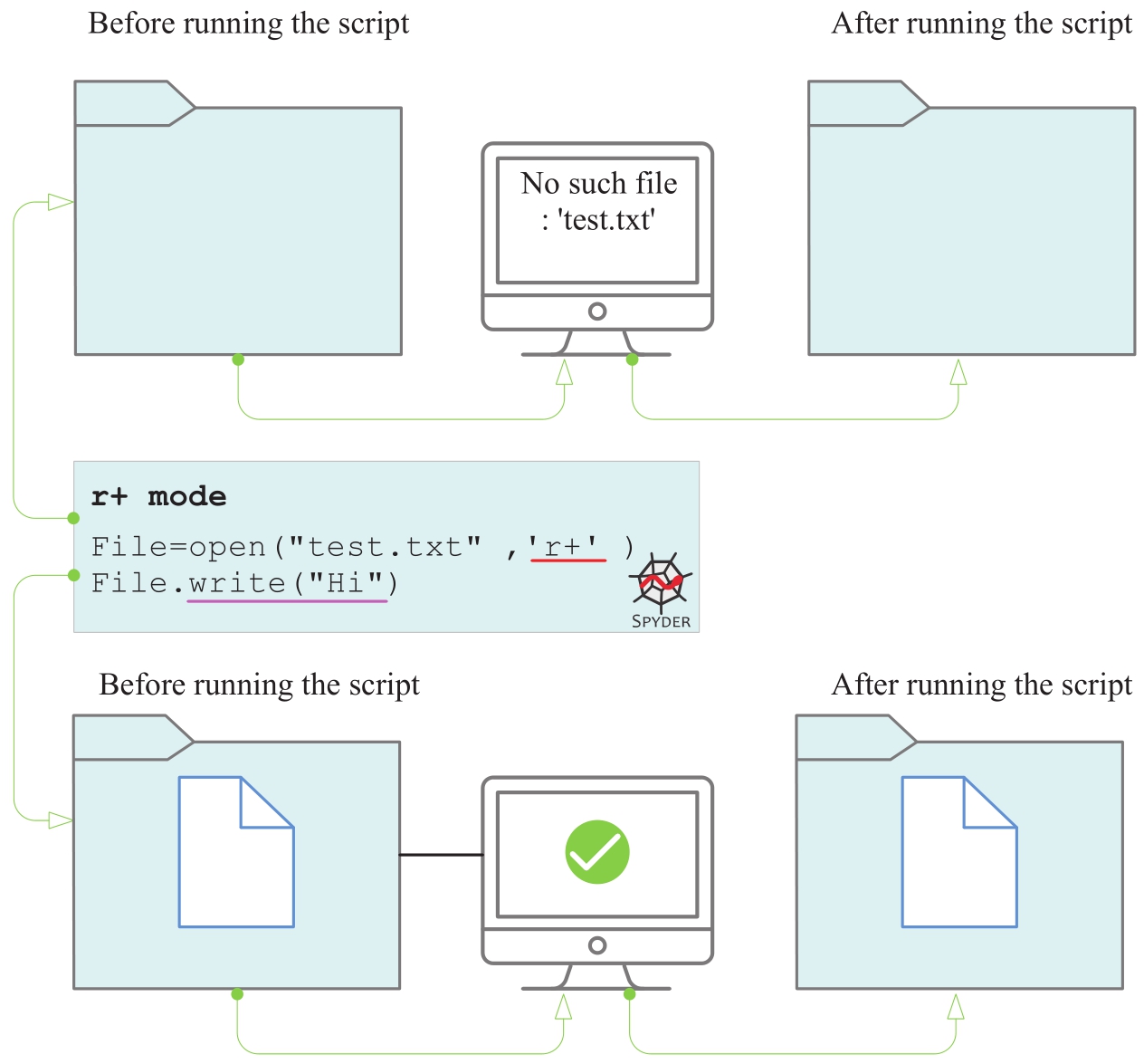 Python提供了6种文件操作模式,包括r、r+、w、w+、a、a+。如表2-11对比了这6种文件操作模式的相似之处和不同之处。这里详细地阐述这些文件操作模式的细微区别。虽然r和r+都可以用来读取文件内容,但r+可以在文件中写入内容。相对于w,w+除了可以向文件写入内容,还可以用来读取文件内容。a和a+都可以在文件末尾添加内容,但a不能用来读取文件,而a+可以。r、r+、w、w+在刚打开文件时,指针均位于文件开头,而a和a+的指针在文件末尾。当文件不存在时,使用r和r+会报错,而w、w+、a、a+则会创建该空文件。当文件已经存在时,使用w和w+会清空原文件内容并从文件开头写入新的内容。图2-14、图2-15和图2-16用一简单的例子对比了r+、w+和a+将内容写入文件中的细微区别。