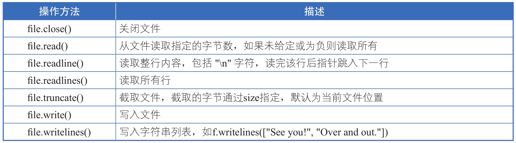 表2-12给出了一些常用的文件操作方法,包括关闭文件、读取和写入等。