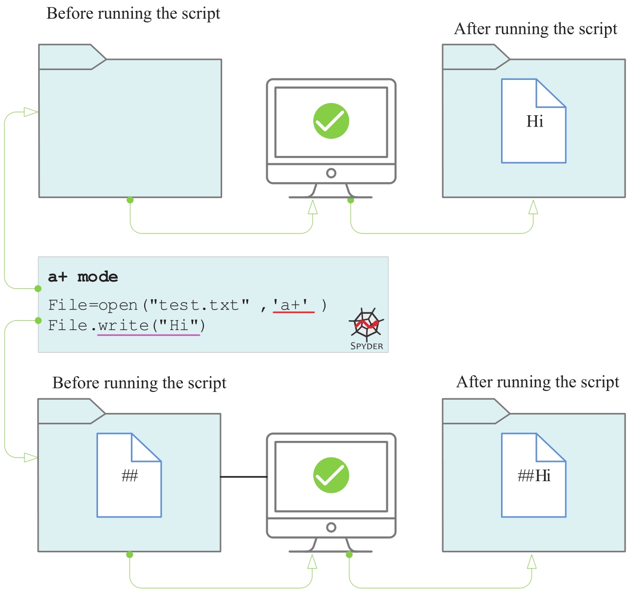 如图2-16所示为a+模式将字符串“Hi”写入“test.txt”时的情况。和w+模式类似,当“test.txt”文件不存在时,使用a+模式进行写入时,系统会自动创建“test.txt”文件并将字符串“Hi”写入该文件中。当“test.txt”文件已经存在并且包含字符“##”时,a+模式会保留原文件内容,并将字符串“Hi”追加到“test.txt”末尾。