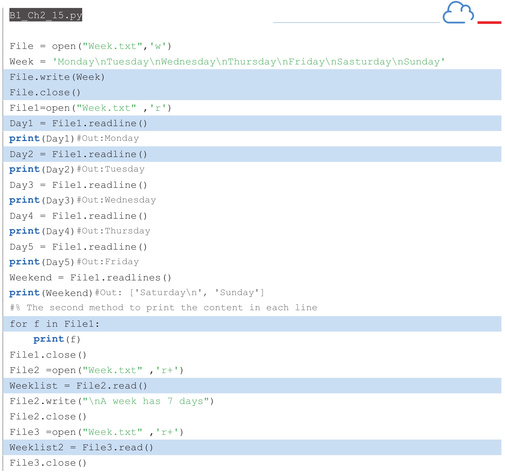 在以下的例子中,首先在文件夹相对路径中创建一个叫“Week.txt”的文件,并写入多行内容,然后读取这些内容,再然后在显示窗口显示每行的内容,最后关闭这个“Week.txt”文件。被打开的文件对象也是一个迭代器,因此可以在for循环中被调用,用来读取被打开的文件对象的每一行内容。