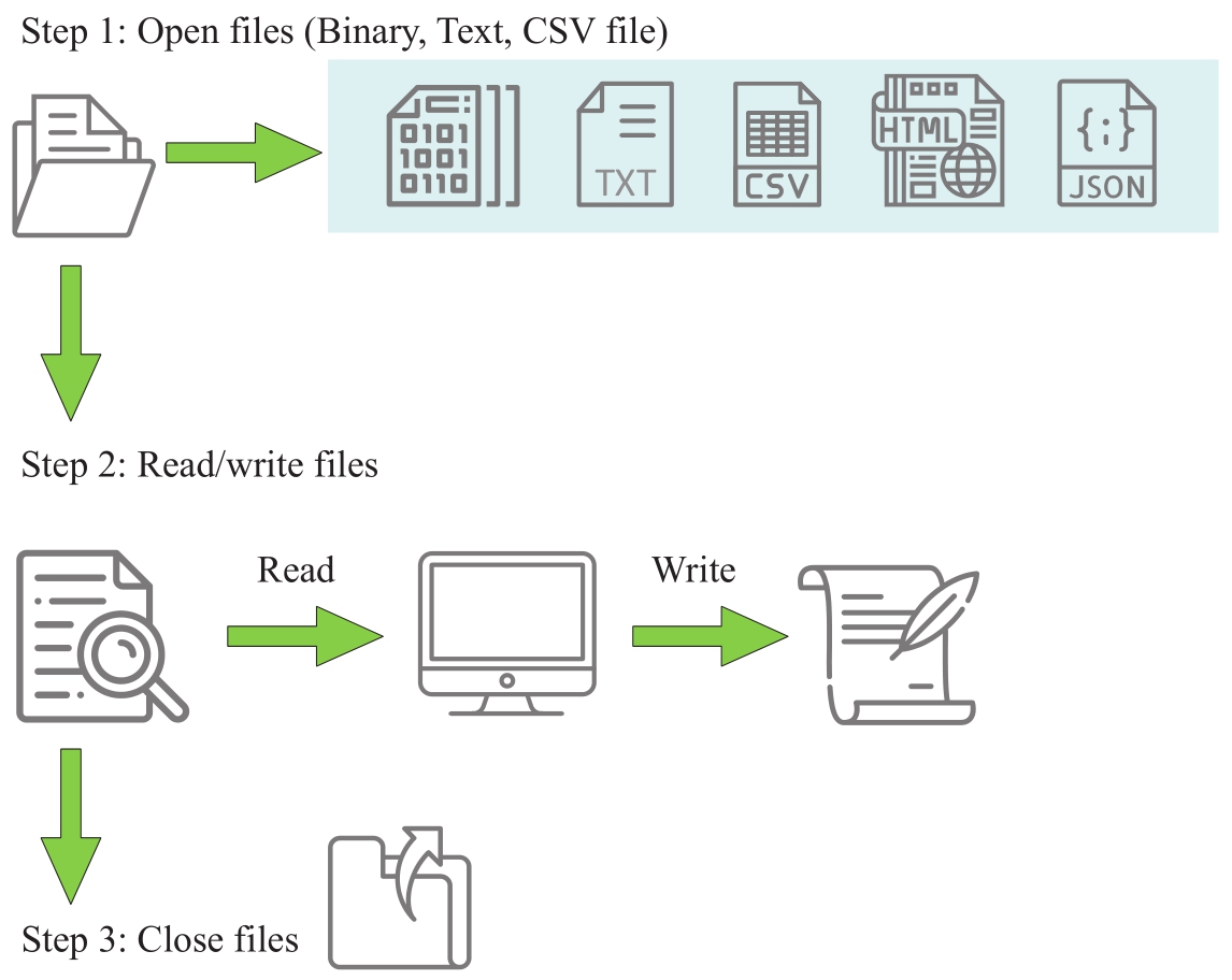 本节将会介绍一些常用的文件读写操作,包括创建文件、打开文件、读取文件和写入文件等。Python支持多种文件格式的操作,包括 二进制文件 (binary)、 txt文本文件 (text)、 逗号分隔值CSV文件 (Comma-Separated Values, CSV)、 HTML超文本标记语言文件 (Hypertext Markup Language, HTML)、 JSON文件 (JavaScript Object Notation, JS对象简谱)。在Python中进行文件操作时,需要先打开文件,再读/写文件,最后关闭文件,如图2-13所示。