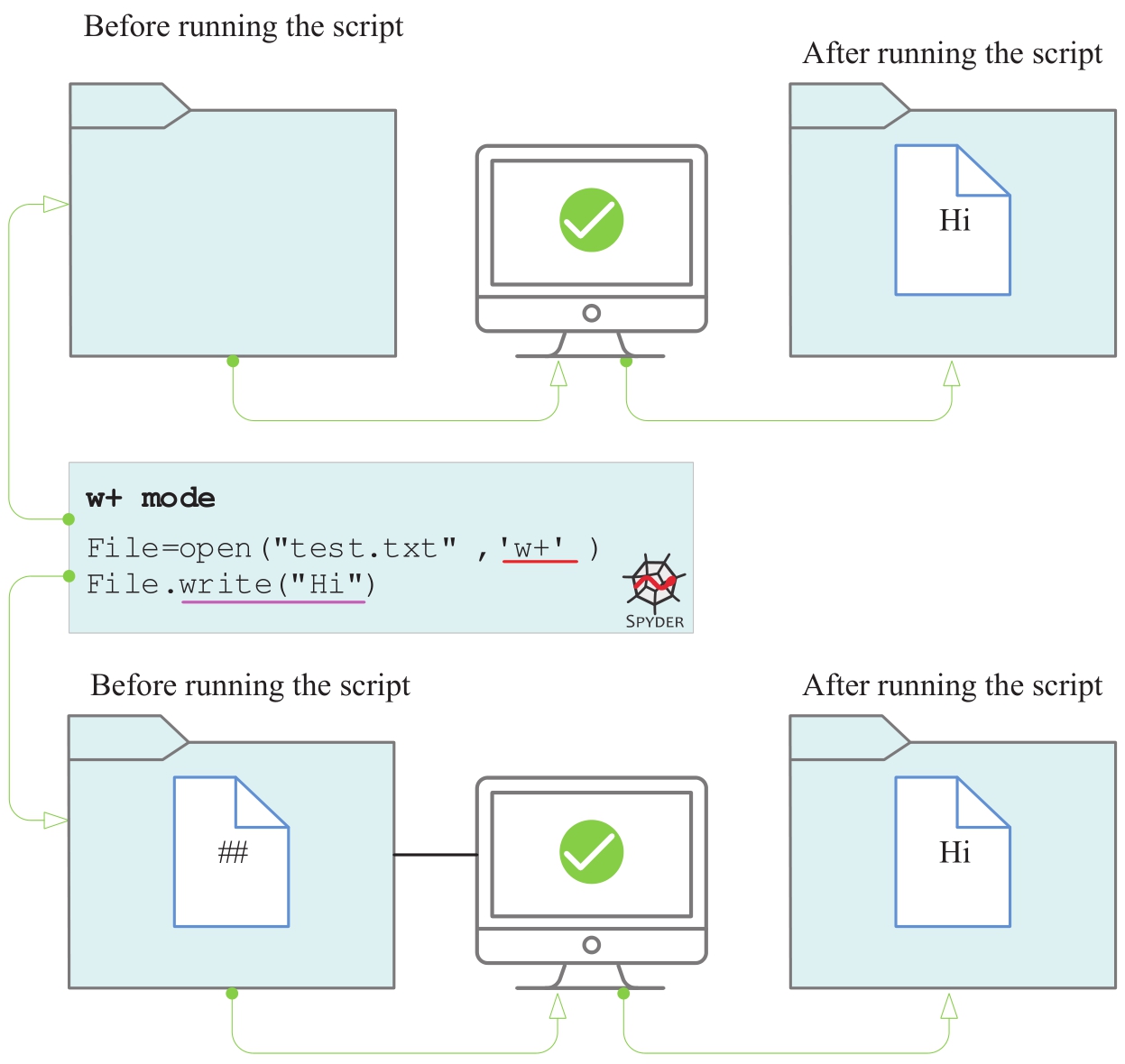 如图2-15所示为w+模式将字符串“Hi”写入“test.txt”时的情况。当“test.txt”文件不存在时,使用w+模式进行写入时,系统会自动创建“test.txt”文件并将字符串“Hi”写入该文件中。当“test.txt”文件已经存在并且包含字符“##”时,w+模式会先清空文件中原有的内容,并将字符串“Hi”写入“test.txt”中。