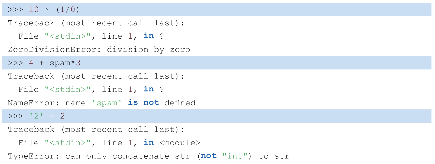 在运行Python代码时,除了一些可避免的语法错误外,还常常会遇到一些异常,如下所示。