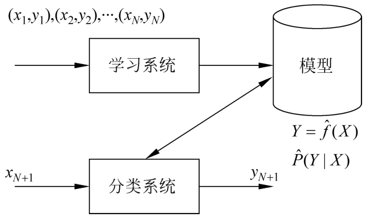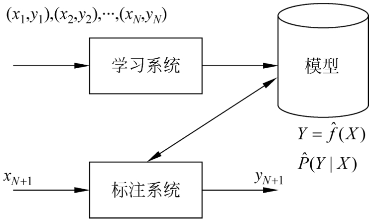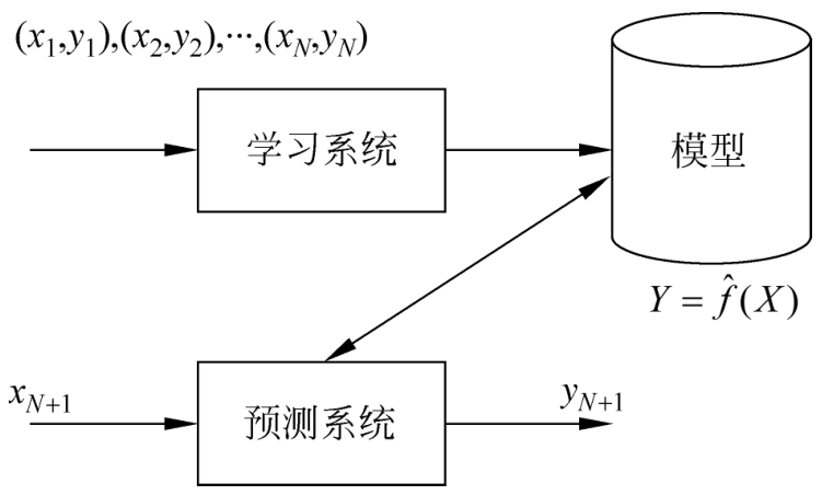这里, x i ∈ R n 是输入, y ∈ R 是对应的输出, i =1,2,…, N 。学习系统基于训练数据构建一个模型,即函数 Y = f ( X );对新的输入 x N +1 ,预测系统根据学习的模型 Y = f ( X )确定相应的输出 y N +1 。