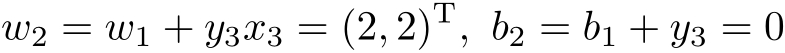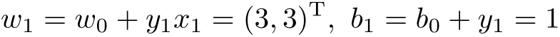 (2)对 x 1 =(3,3) T , y 1 ( w 0 · x 1 + b 0 )=0,未能被正确分类,更新 w , b