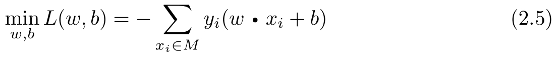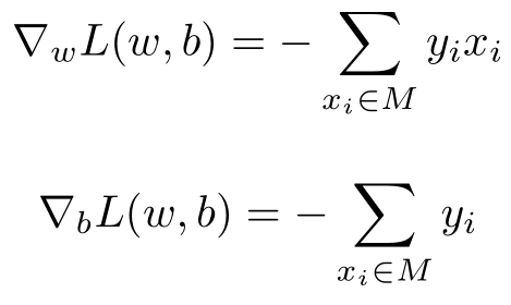 假设误分类点集合 M 是固定的,那么损失函数 L ( w , b )的梯度由