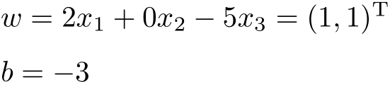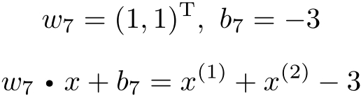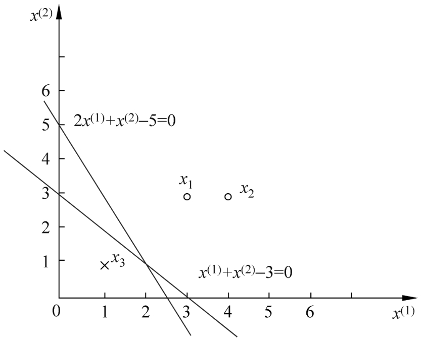 这是在计算中误分类点先后取 x 1 , x 3 , x 3 , x 3 , x 1 , x 3 , x 3 得到的分离超平面和感知机模型。如果在计算中误分类点依次取 x 1 , x 3 , x 3 , x 3 , x 2 , x 3 , x 3 , x 3 , x 1 , x 3 , x 3 ,那么得到的分离超平面是2 x (1) + x (2) −5=0。