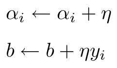 逐步修改 w , b ,设修改 n 次,则 w , b 关于( x i , y i )的增量分别是 α i y i x i 和 α i y i ,这里 α i = n i η,n i 是点( x i , y i )被误分类的次数。这样,从学习过程不难看出,最后学习到的 w , b 可以分别表示为