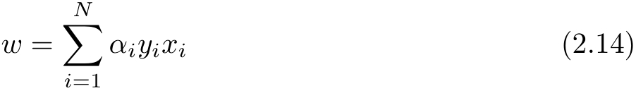 对偶形式的基本想法是,将 w 和 b 表示为实例 x i 和标记 y i 的线性组合的形式,通过求解其系数而求得 w 和 b 。不失一般性,在算法2.1中可假设初始值 w 0 , b 0 均为0。对误分类点( x i , y i )通过