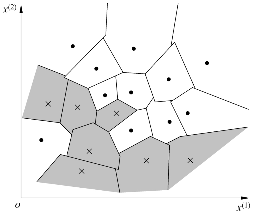 k 近邻法中,当训练集、距离度量(如欧氏距离)、 k 值及分类决策规则(如多数表决)确定后,对于任何一个新的输入实例,它所属的类唯一地确定。这相当于根据上述要素将特征空间划分为一些子空间,确定子空间里的每个点所属的类。这一事实从最近邻算法中可以看得很清楚。