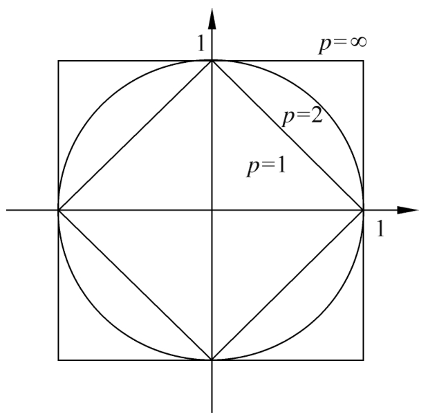 图3.2给出了二维空间中 p 取不同值时,与原点的 L p 距离为1( L p =1)的点的图形。