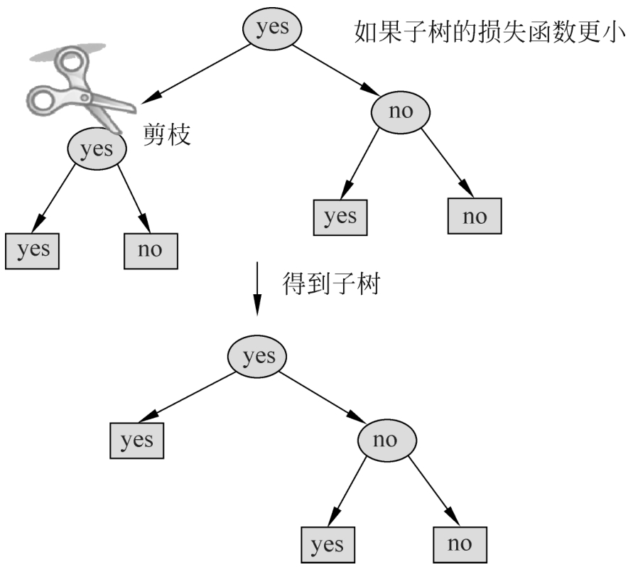 在决策树学习中将已生成的树进行简化的过程称为剪枝(pruning)。具体地,剪枝从已生成的树上裁掉一些子树或叶结点,并将其根结点或父结点作为新的叶结点,从而简化分类树模型。