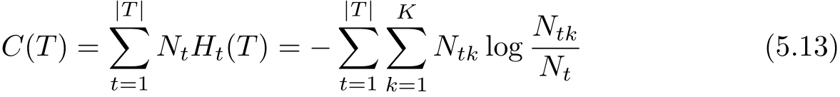 决策树的剪枝往往通过极小化决策树整体的损失函数(loss function)或代价函数(cost function)来实现。设树 T 的叶结点个数为| T |, t 是树 T 的叶结点,该叶结点有 N t 个样本点,其中 k 类的样本点有 N tk 个, k =1,2,…, K , H t ( T )为叶结点 t 上的经验熵, α ≥0为参数,则决策树学习的损失函数可以定义为