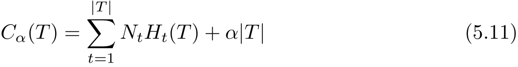 式(5.11)或式(5.14)定义的损失函数的极小化等价于正则化的极大似然估计。所以,利用损失函数最小原则进行剪枝就是用正则化的极大似然估计进行模型选择。