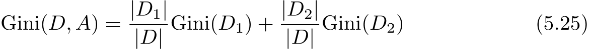 (1)设结点的训练数据集为 D ,计算现有特征对该数据集的基尼指数。此时,对每一个特征 A ,对其可能取的每个值 a ,根据样本点对 A = a 的测试为“是”或“否”将 D 分割成 D 1 和 D 2 两部分,利用式(5.25)计算 A = a 时的基尼指数。