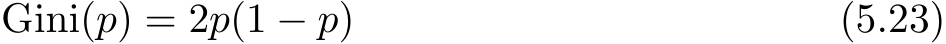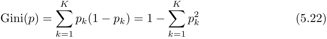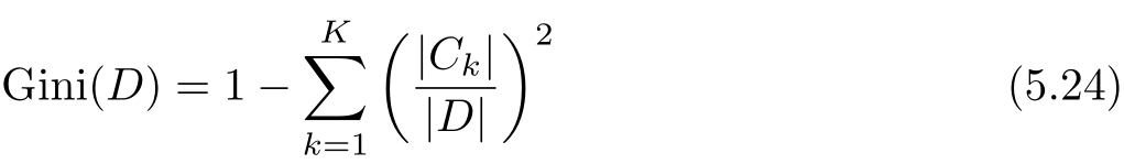 定义5.4(基尼指数) 分类问题中,假设有 K 个类,样本点属于第 k 类的概率为 p k ,则概率分布的基尼指数定义为