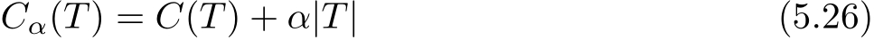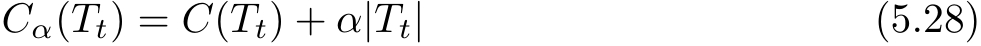 其中, T 为任意子树, C ( T )为对训练数据的预测误差(如基尼指数),| T |为子树的叶结点个数, α ≥0为参数, C α ( T )为参数是 α 时的子树 T 的整体损失。参数 α 权衡训练数据的拟合程度与模型的复杂度。