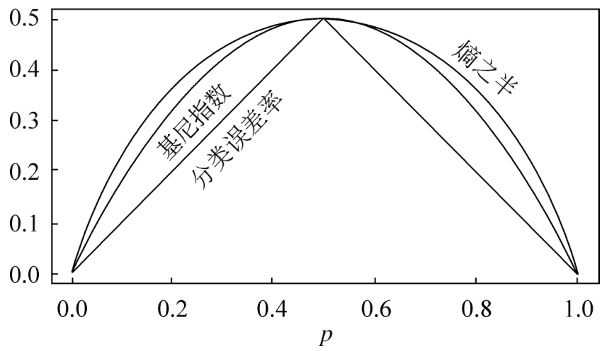 图5.7显示二类分类问题中基尼指数Gini( p )、熵(单位比特)之半 H ( p )/2和分类误差率的关系。横坐标表示概率 p ,纵坐标表示损失。可以看出基尼指数和熵之半的曲线很接近,都可以近似地代表分类误差率。