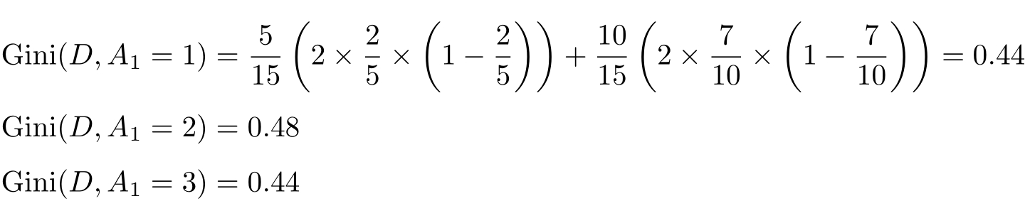 由于Gini( D , A 1 =1)和Gini( D , A 1 =3)相等,且最小,所以 A 1 =1和 A 1 =3都可以选作 A 1 的最优切分点。