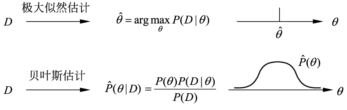 贝叶斯估计与极大似然估计在思想上有很大的不同,代表着统计学中贝叶斯学派和频率学派对统计的不同认识。其实,可以简单地把两者联系起来,假设先验分布是均匀分布,取后验概率最大,就能从贝叶斯估计得到极大似然估计。图1.6对贝叶斯估计和极大似然估计进行比较。