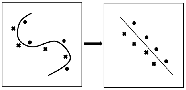 把线性模型扩展到非线性模型,直接的做法是显式地定义从输入空间(低维空间)到特征空间(高维空间)的映射,在特征空间中进行内积计算。比如,支持向量机,把输入空间的线性不可分问题转化为特征空间的线性可分问题,如图1.7所示。核方法的技巧在于不显式地定义这个映射,而是直接定义核函数,即映射之后在特征空间的内积。这样可以简化计算,达到同样的效果。