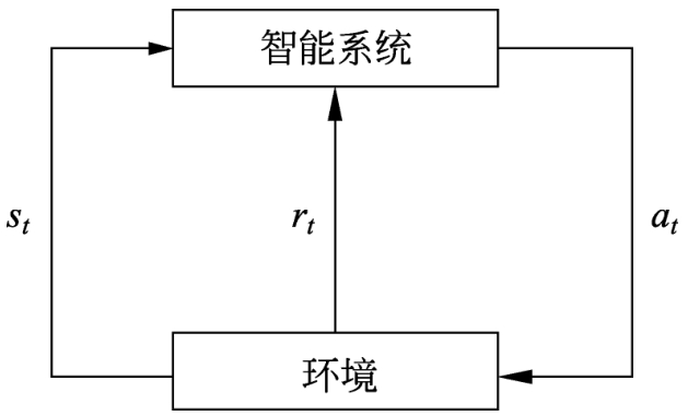 智能系统与环境的互动如图1.3所示。在每一步 t ,智能系统从环境中观测到一个状态(state) s t 与一个奖励(reward) r t ,采取一个动作(action) a t 。环境根据智能系统选择的动作,决定下一步 t +1的状态 s t +1 与奖励 r t +1 。要学习的策略表示为给定的状态下采取的动作。智能系统的目标不是短期奖励的最大化,而是长期累积奖励的最大化。强化学习过程中,系统不断地试错(trial and error),以达到学习最优策略的目的。