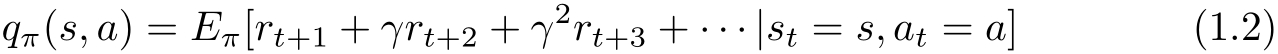 动作价值函数(action value function)定义为策略 π 的从某一个状态 s 和动作 a 开始的长期累积奖励的数学期望: