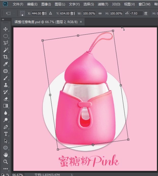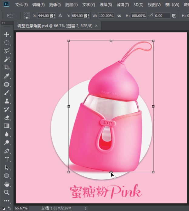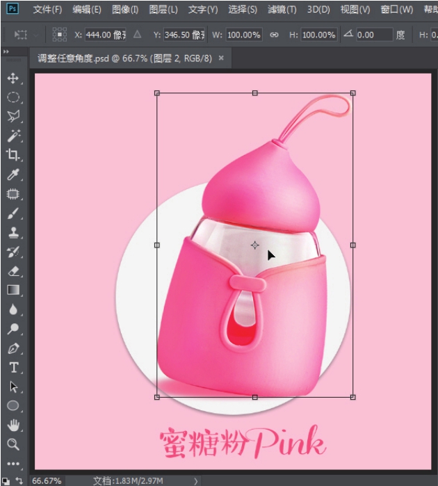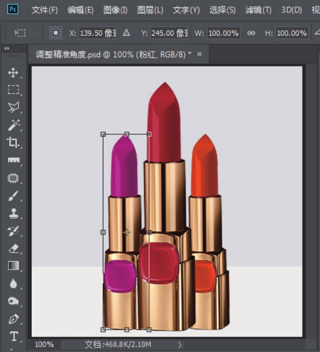 第1步: 打开素材包\素材文件\第2章\2.2\“调整精准角度”图像文档,单击选择左侧的粉色口红,按Ctrl+T组合键,进入变形框编辑模式,如图2-19所示。
