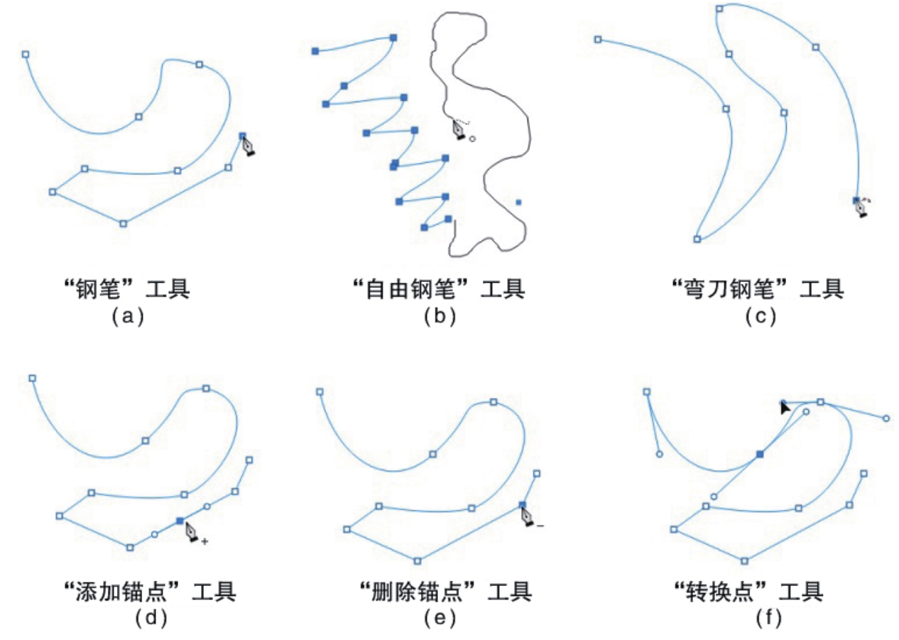 在钢笔工具组中,“钢笔”工具用于绘制具有最高精度的图像,灵活度最高;“自由钢笔”工具能像使用铅笔在纸上绘图一样来绘制路径;“弯度钢笔”工具可绘制自带弧度的路径;“添加锚点”工具、“删除锚点”工具,即在绘制的路径上添加或删除锚点;“转换点”工具则用于调整锚点的控制手柄,各绘制效果如图3-40所示。
