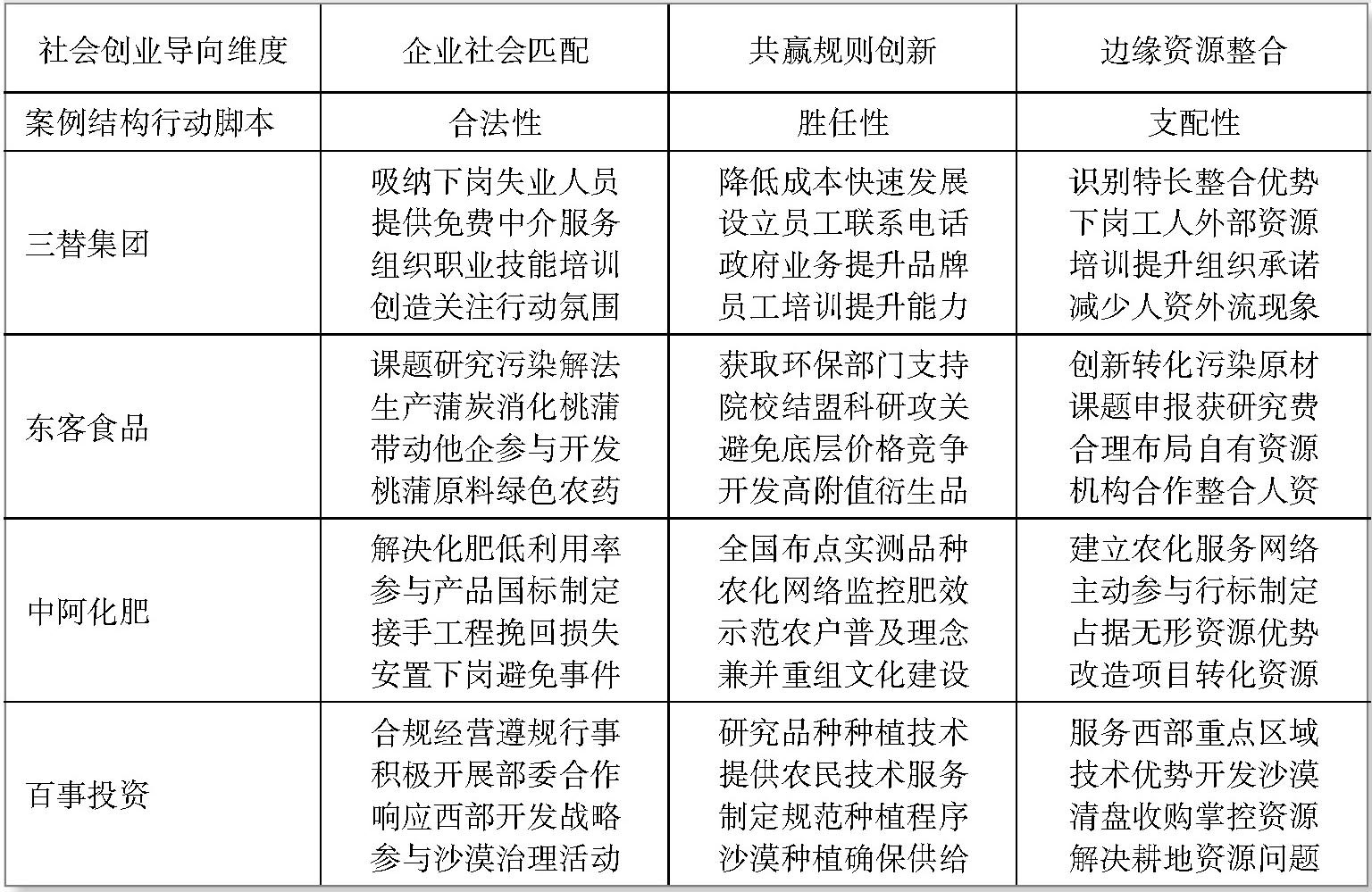 案例分析:王重鸣在主持和承担国家自然科学基金资助的全国首项创业管理领域重点项目“基于人与组织多层互动匹配的企业家成长机制与创业环境研究”时开展了一系列案例研究。这项研究围绕方兴未艾的社会型创业开展并行案例分析,运用结构行动理论的脚本分析框架进行研究,从合法性、胜任性和支配性三个方面,探索和界定社会型创业导向的企业社会匹配、共赢规则创新和边缘资源整合三大维度及其特征。依据国际上判断社会型创业的标准(组织行为创新、直接社会影响、自我持续能力等)开展采样,选择了杭州三替公司、临安东客食品公司、中阿化肥公司、百事投资公司四家企业组成代表性样本。运用半结构化访谈及案例资料采集获取多种资料数据。跨案例分析首次提出我国社会型创业导向新概念,为社会型创业的研究与发展提供了新的理论框架。见表1.1。